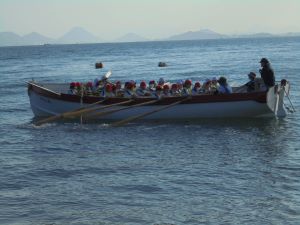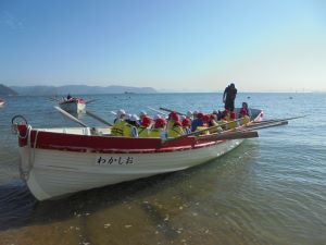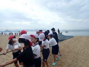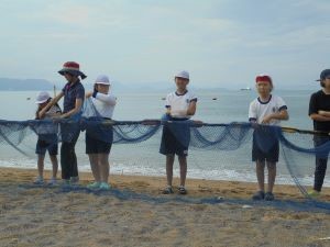 他校の友達と協力しながら、カッター研修や地引き網などを一生懸命頑張りました。