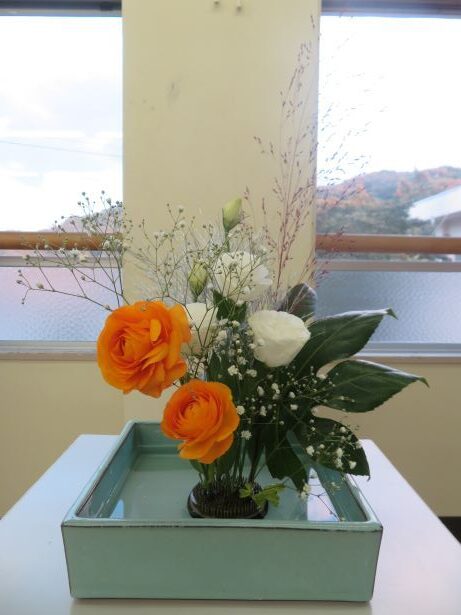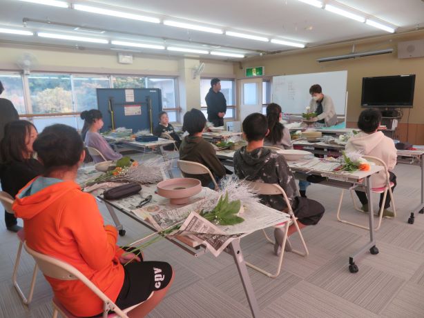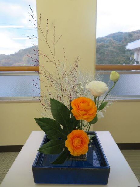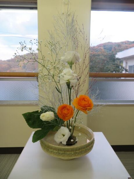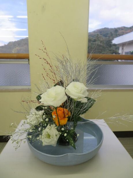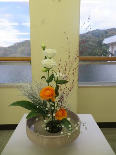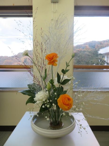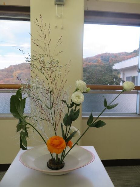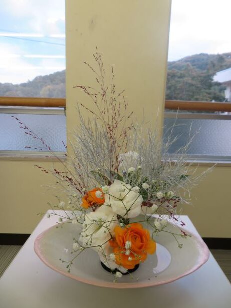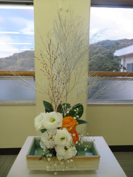 11月14日(金) スクールサポーターの先生に来ていただき、今年度2回目の華道クラブです。今回のテーマは、「初雪」でした。紅葉した木々に初雪が降ったところを想像しながら、真剣に生けました。初めて花を生ける舎生もいましたが、楽しみながら個性あふれる作品になりました。学園祭で多くの方に観てもらうことができました。