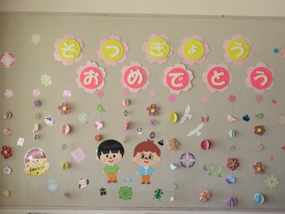 幼児はかわいい壁面や廊下の飾りを見て、さわったり、はしゃいだりしていました。幼児からは感謝のメッセージももらいました。
